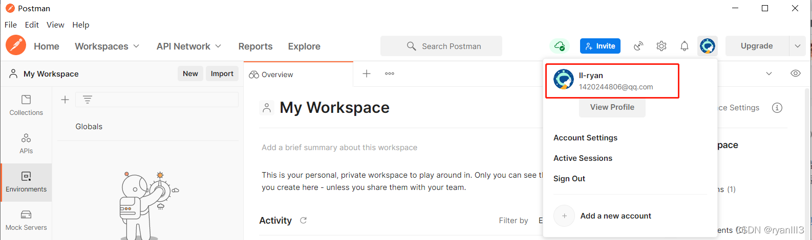 - Workspaces 工作空间 - Collections - 集合,项目集合- API - API文档- Environments - 环境变量,全局变量- Mock Server - 模拟服务器,虚拟服务器- Monitor - 监听服务- History - 请求历史记录