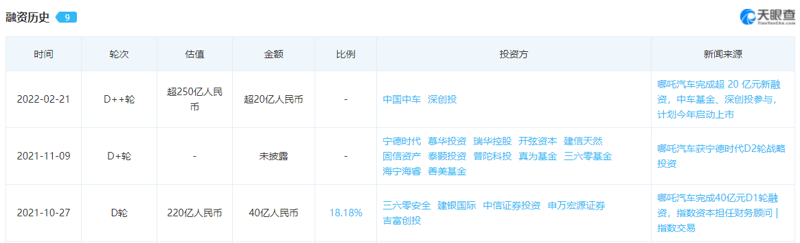 天眼查APP信息显示,哪吒汽车母公司合众新能源汽车有限公司于2月21日,再度获得了由中车基金与深创投参与的D++轮超20亿元融资。在完成此轮融资后,哪吒汽车估值超过了250亿人民币。