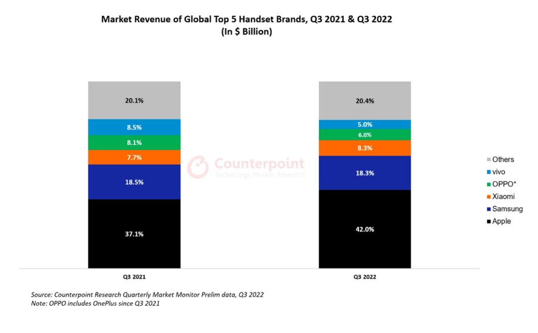 借助新机型的热度,以及“锚定效应”策略,苹果确实收获了亮眼的市场数据。Counterpoint披露的调研报告显示,2022年Q3,苹果iPhone销售额同比增长10%,平均销售价格增长7%。
