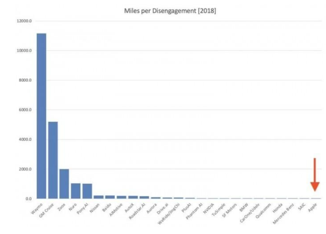 加州车辆管理局的“脱离报告”显示,2018年,苹果自动驾驶汽车每行驶1000英里要脱离871.65次,位居排行榜的末尾。这一成绩,距离苹果理想中完全自动驾驶无疑有较大差距。