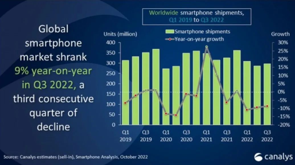 不过遗憾的是,iPhone所处的智能手机行业大盘已经触顶。据Canalys数据显示,2022年Q1-Q3,全球智能手机出货量分别同比下跌11%、9%以及9%。自2017年以来,智能手机行业的红利就开始消逝,突如其来的疫情更加剧了市场的萎缩。