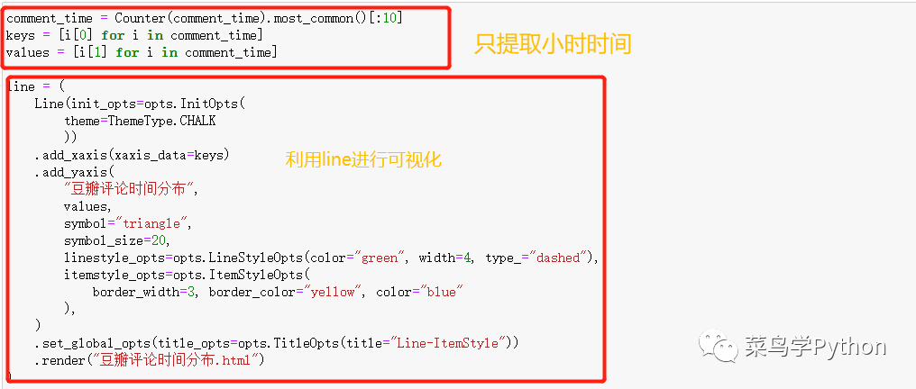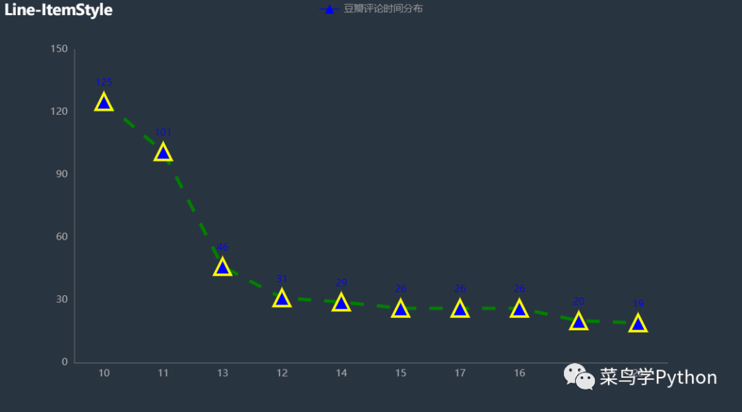上述的程序首先提取了评论时间中的小时信息,然后利用pyecharts中的Line类进行可视化展示。