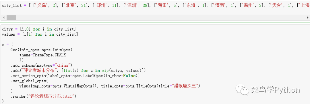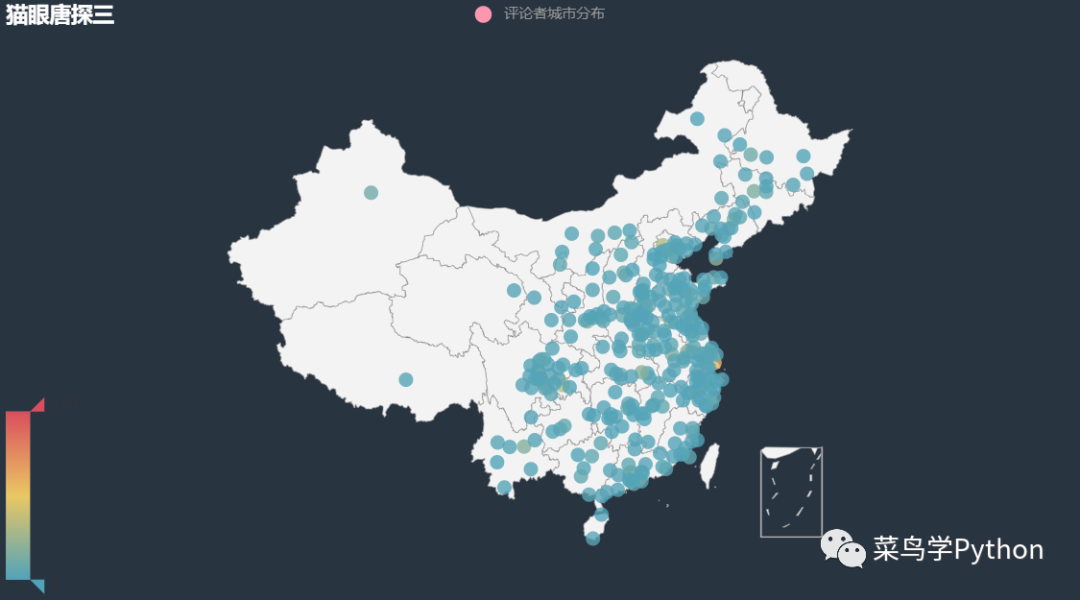 通过对于猫眼影评者城市的信息统计,并利用Geo类进行可视化展示,其结果如下图所示。