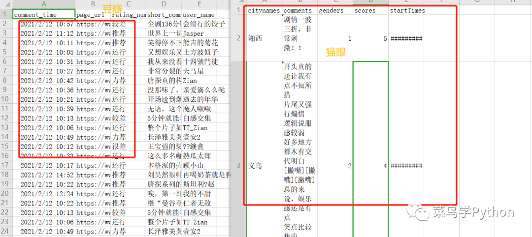 上述的程序中,通过self.save_data函数来调用self.parse_data函数解析url,而在self.parse_data函数中,通过解析请求网页所获得的json数据,提取我们想要抓取的评论、用户所在城市等信息。对于豆瓣、猫眼所抓取的数据,如下图所示: