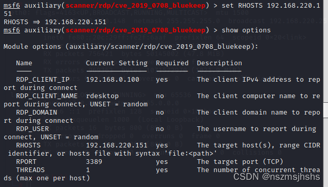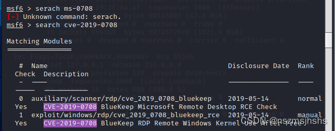 首先打开kali的msf(msfconsole),输入命令:search cve-2019-0708,得到漏洞模块(有一点就是我的kali是新版里面有漏洞模块,老版本的没有需要下载并更改。避免麻烦建议大家用新版本的)。第一个模块是检测靶机里有没有该漏洞。我们先检测输入命令: use auxiliary/scanner/rdp/cve_2019_0708_bluekeep