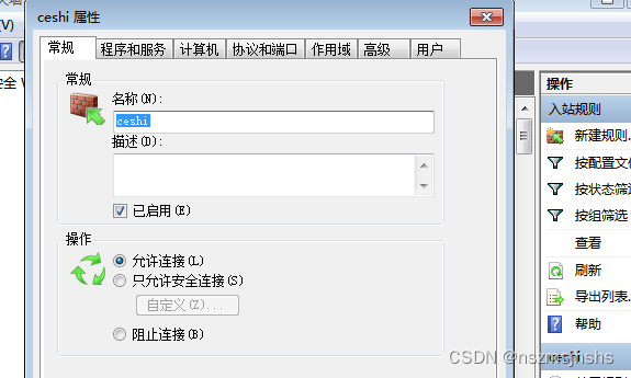 靶机需要额外的内部环境配置,首先需要将靶机的防火墙关闭,其次将远程控制功能开启并允许所有机可以远程控制。然后将防火墙设置高级模式,在高级模式中的添加入站规则,设置新增端口3389开放并命名为ceshi。演示如图,依次排列