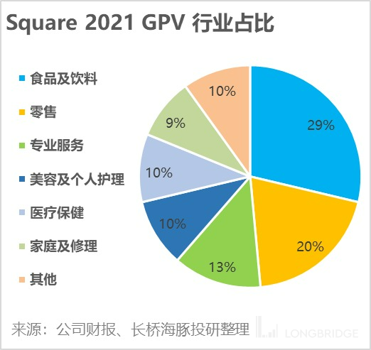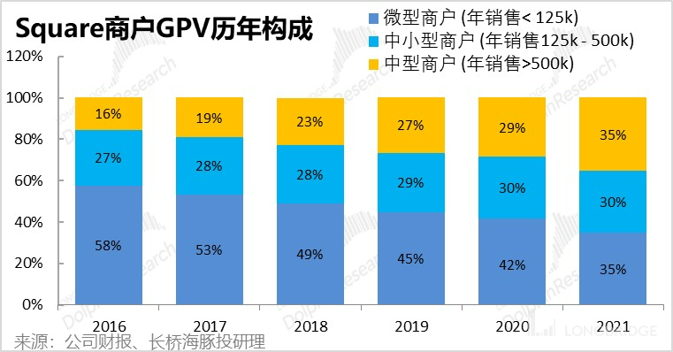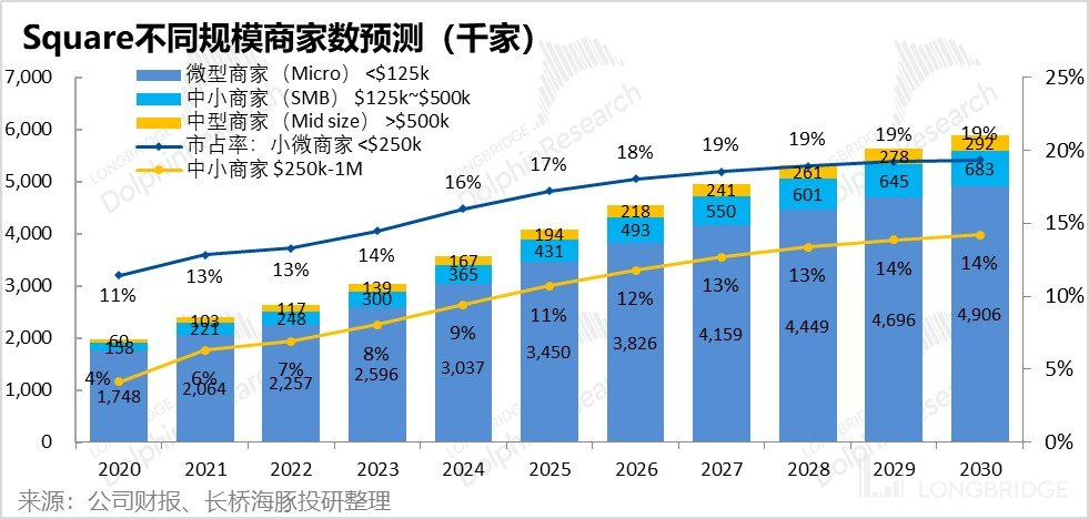那么经计算,2021 年 Square 的活跃商数户约在 240 万左右。其中,微型商家约有 200 万,中小型商户约 22 万,中型商商户则有约 10 万,分别占全美对应规模商家总数的约 13%,和 6%。