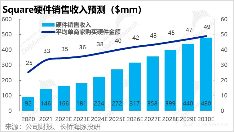 因此,我们预计硬件销售收入的增速也会高于商家增速,详细来说,我们预计硬件销售收入将由 2021 年的 1.5 亿增长到 30 年的 4.8 亿。