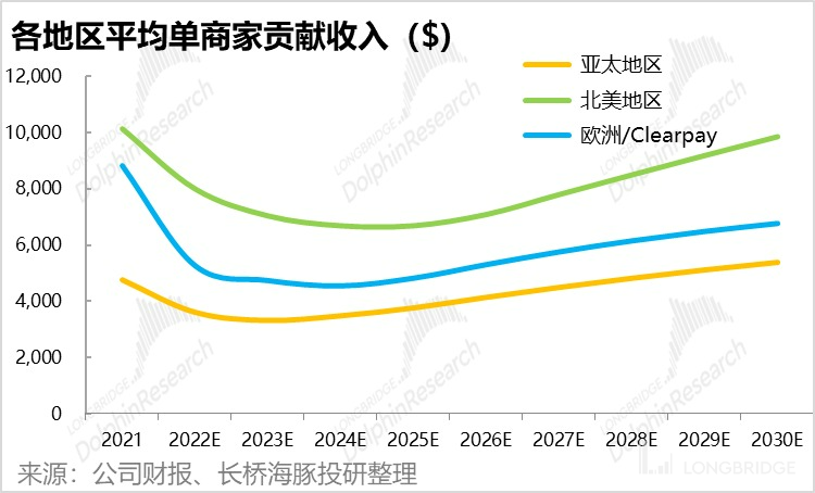 基于以上假设,海豚君估算 AfterPay 的总营收有望从 2021 年的 8.5 亿增长到 2030 年的 26.6 亿,其中 12.5 亿的增长由北美地区贡献。