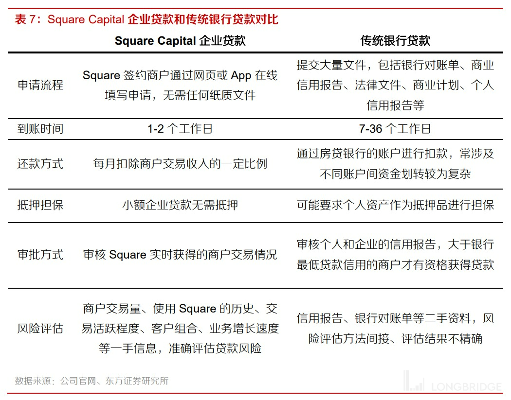 2)商家贷款服务(Square Loan),公司通过拥有借贷牌照的子公司(Square Financial Service)向合作商家提供的短期经营贷款服务。一般贷款金额在 $300-$250k。对于商户而言,Square Loan 的优势在于申请简单(可通过商户的 Square 账户快速申请),审批迅速(可在 1-2 个工作日到账),且无需抵押和信用审核(Block 直接基于商户的销售和收款情况审核)。