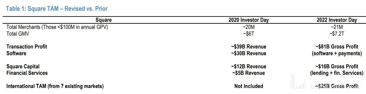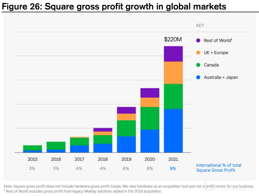 而根据公司最近在 2022 Investor Day 上披露的信息,Square 在美国外其他 7 国的潜在市场规模为 250 亿美元 (毛利率口径),相当于美国的 1/3。
