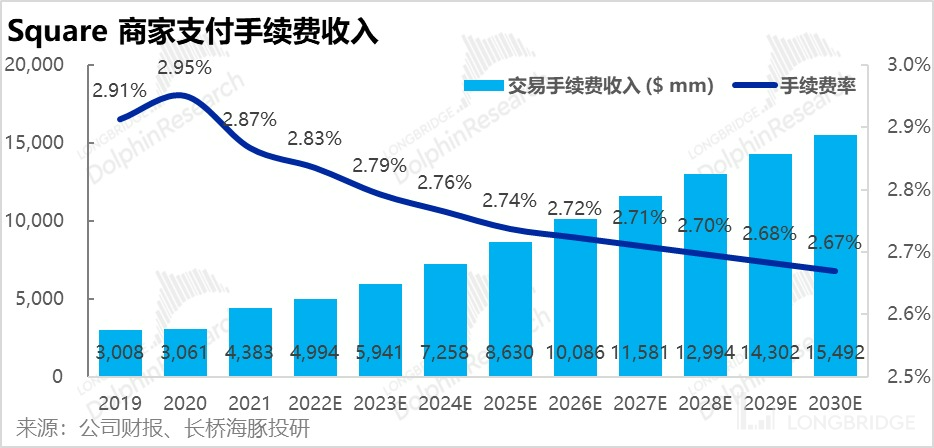 基于上述逻辑,我们预计支付手续费率会从 2021 的 2.87%,下降缓慢下降到 2030 年 2.67%。再乘以 30 年 $580bn GPV,可推算出 2030 年 Square 支付手续费收入可达约 154 亿美元。