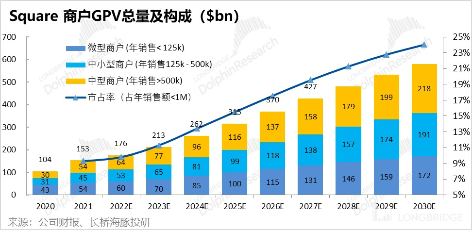 那么结合上文全美商家总数,海豚君预计到 2030 年,Square 在年销售<$250k 商家中的市占率由 13% 提升到 19%;而年销售在 $250k-$1m 的商家中的市占率由 6% 提升到 14%。因此,Square 的商户规模将由 2021 年的约 240 万,增长到 2030 年的约 580 万。