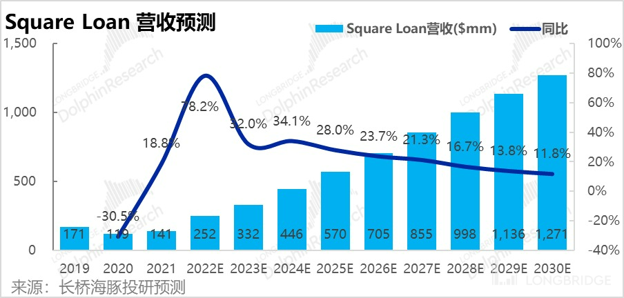 基于以上假设,我们预测 Square Loan 的营收可由 2021 年的 1.4 亿增长到 30 年的 12.7 亿,可见增长弹性相当大。