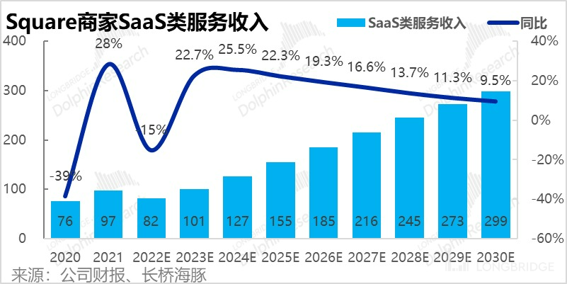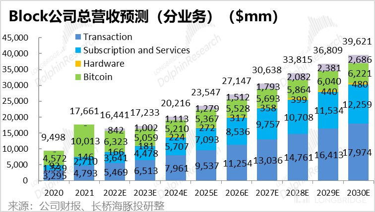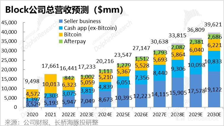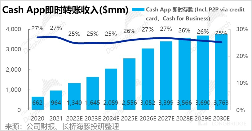 我们假设到 2030 年 Cash App Pay 的人均年支付金额提升到 $940(据海豚君推算占美国人均消费额的 3%),那么 Cash App 的营收有望在 2030 年达到近 25 亿美元。