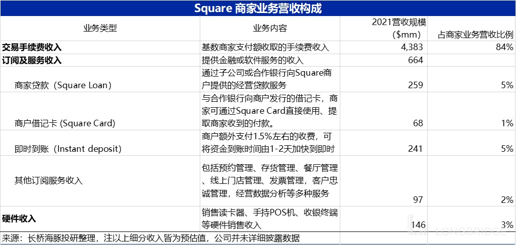 因此,基于硬件销售带来的用户基本盘,Square 商家业务的主要营收实际是来自支付手续费(一般为支付额的 2.6%-3.5%),以及面向商家提供的各类订阅和服务收入,主要包括: