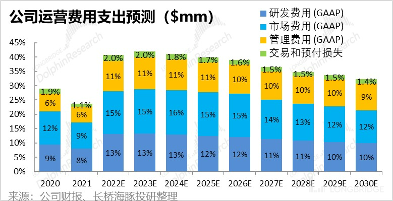 因此,在 2022 到 23 年、甚至到 24 年公司的三费支出都会明显扩张,从而严重拖累公司的经营利润。不过,海豚君认为之后随着公司新业务逐步成熟,且公司营收规模的扩大,三费支出也将稳步回落,经营杠杆重新显现。