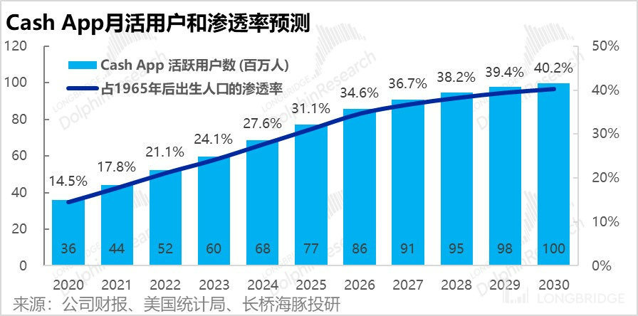 那么展望未来,我们假设到 2030 年 Cash App 在美国壮年人口(Z 世代&千禧)的渗透率提升到 55%-60%,假设当前 12 岁以下人口的渗透率到 2030 年对标当前 Z 世代提升到 30%,而 X 世代&Baby Boomer 则由于年纪增长,预计渗透率下滑。