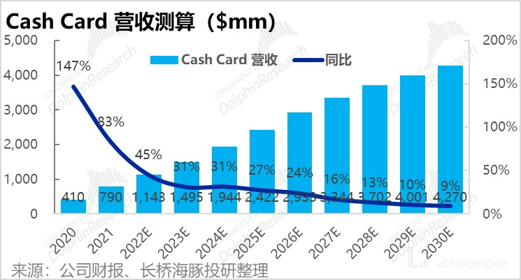 基于以上关键假设,在用户量、渗透率、人均使用金额三个因素都由提升空间的驱动下,我们预测 Cash Card 的营收有望从 2021 年不到 8 亿美元,增长到 2030 年的 43 亿美元。