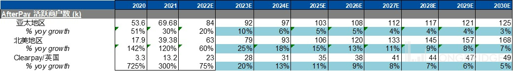那么就 AfterPay 的营收预测,其营收渠道因素可拆分为 AfterPay 收入 = 商家数量 * 单商家 GMV * 公司 take rate。由 Block 在北美拥有的丰富商家资源有助提升 AfterPay 的使用场景,我们预计 AfterPay 在北美能取得最快的增长。在英国和欧洲的增速相对低于美国;而在澳洲大本营因为业务已相当成熟,且地区经济增长潜力低于欧美,因此预计亚太地区的增速最低。详细预测如下。