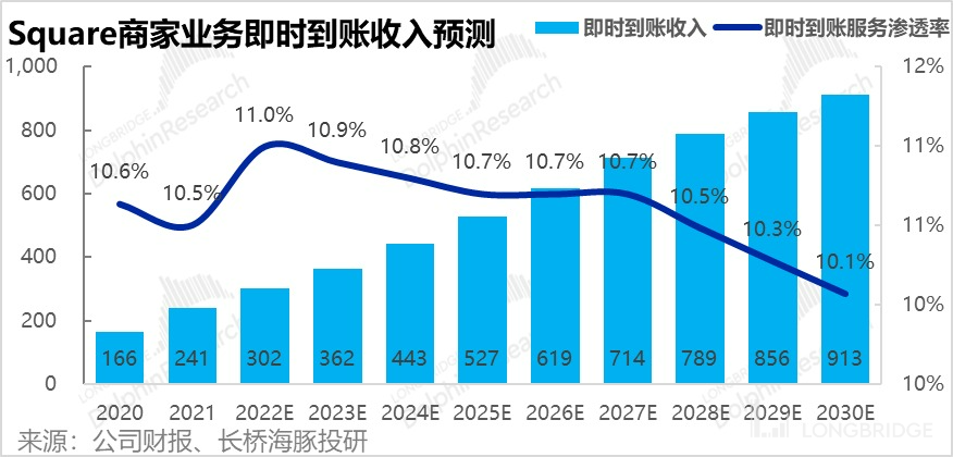 综上假设,我们预测商家业务的即时到账收入将由 21 年的 2.4 亿增长到 30 年的 9.1 亿。