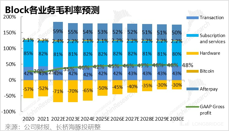 基于上文对 Block 旗下各项业务的分别预测,我们预计 Block 的总营收能由 21 年的 177 亿增长到 30 年的 387 亿;但若剔除比特币业务的影响,公司的营收将由 76 亿增长到 396 亿,增长空间达 4.2 倍。