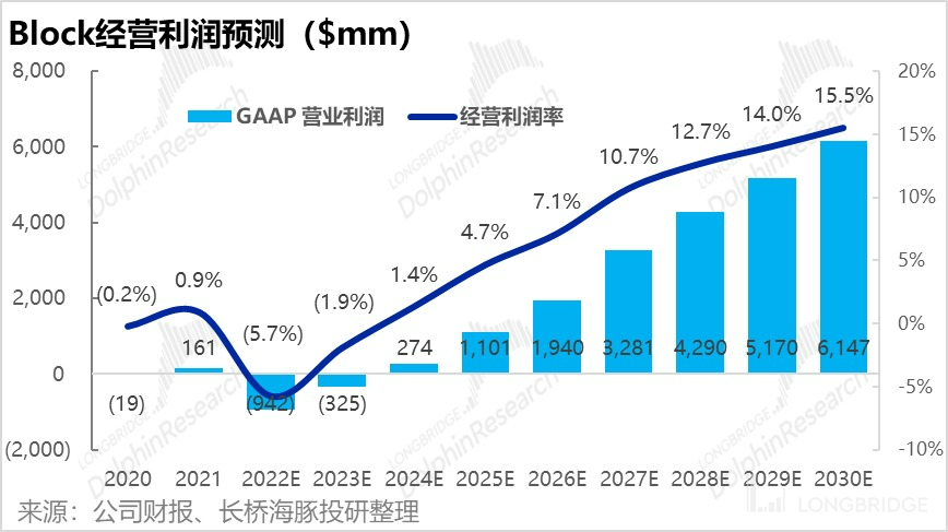 结合我们先前对营收及毛利的预测,以及三费在近期会显著膨胀。海豚君预计 Block 的经营利润在 2022-23 年间会有明显亏损,但到 2024 年会重新转正。且到 2030 年经营利润率有望达到 15.5%