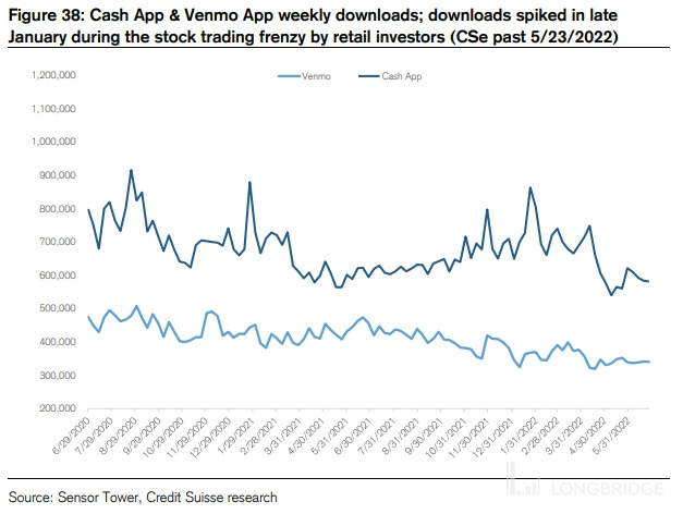从增长速度来看,自 2020 年以来 Cash App 的增长势头一直高于 Venmo(下图中 Cash App 的下载量显著更高);并且 Cash App 更多的金融性功能,也使其在支付之外拥有更多的变现渠道和潜力,因此海豚君认为 Cash App 很有可能在美国数字钱包的混战中胜出。