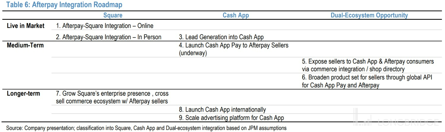 下表展示了,公司给出的短、中、长期融合计划。在 C 端,通过把 AfterPay 分期购物功能整合近 Cash App 内,弥补 Cash App 内缺乏线上购物&支付场景的缺陷,同时也能向 AfterPay 商户推广公司的 Cash App Pay 支付功能。而在 B 端,公司一是可向 Square 现有商家提供先买后付功能,二者也能向 AfterPay 商户推广 Square 的其他服务。