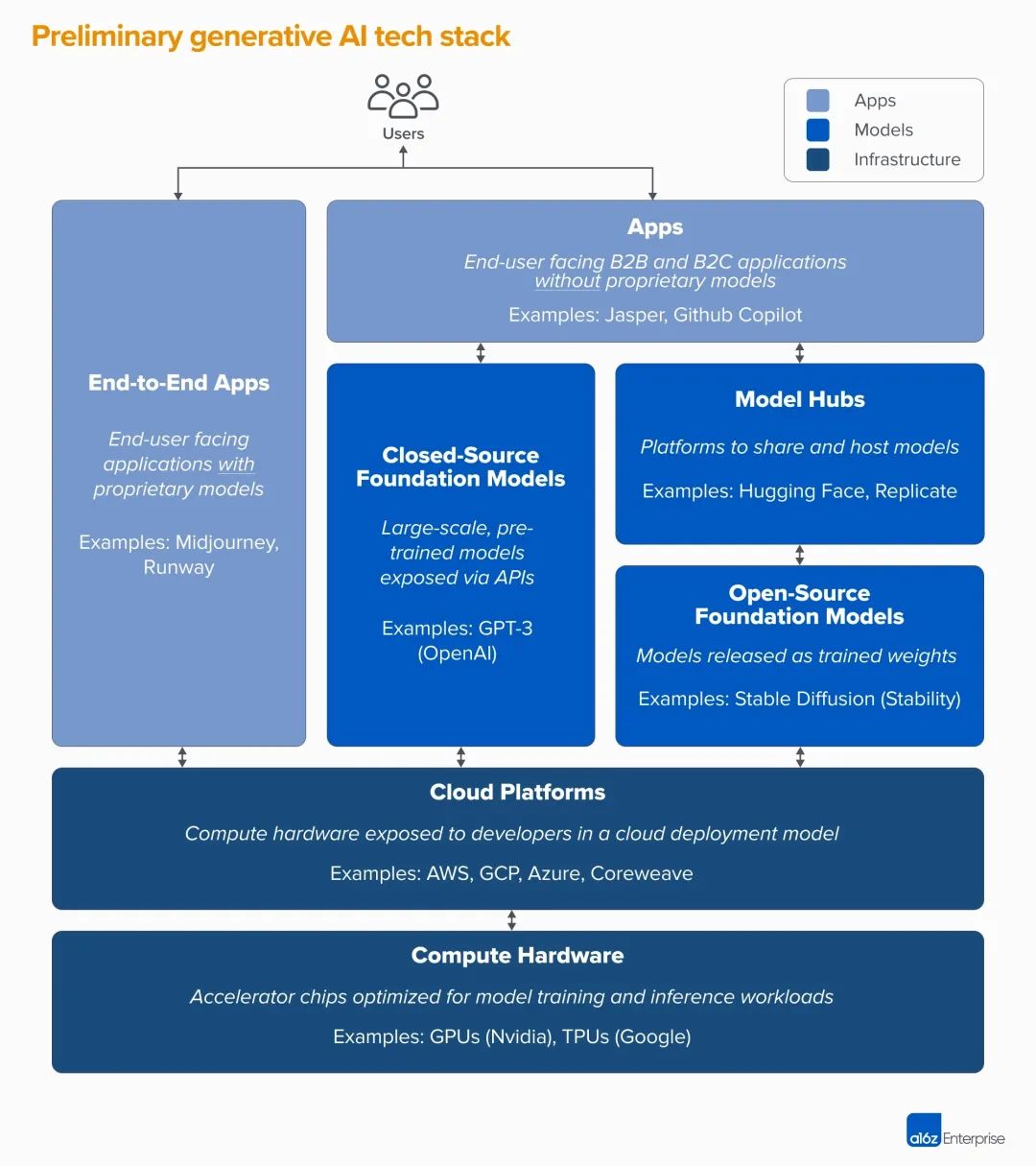 著名风投机构A16Z将生成式AI市场分成了三层: