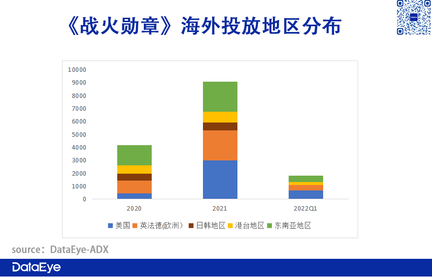 在莉莉丝持续出海战略阶段,《战火勋章》继续保持大规模的投放覆盖,不过也大幅度的提升在美国地区力度。根据DataEye-ADX海外版显示,2021年《战火勋章》在美国地区投放占比高达18.05%。