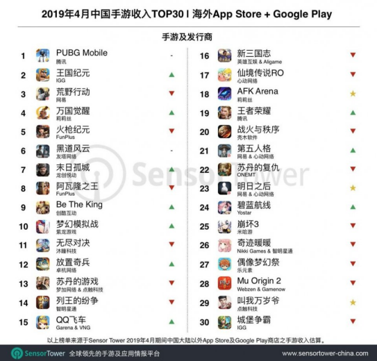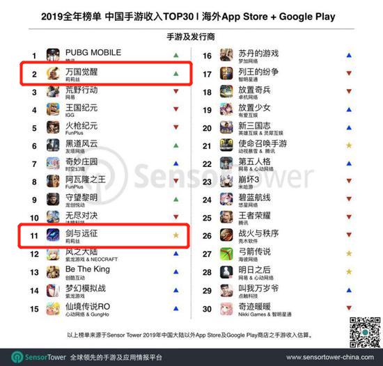 ①从擅长赛道尝试“全球本地化”战略:根据Sensor Tower数据显示,2019年出海收入TOP30榜单中,《万国觉醒》和《剑与远征》分别排名出海收入榜第2名和第11名,莉莉丝也凭此成功登上2019年中国发行商出海收入排行榜第4的宝座。