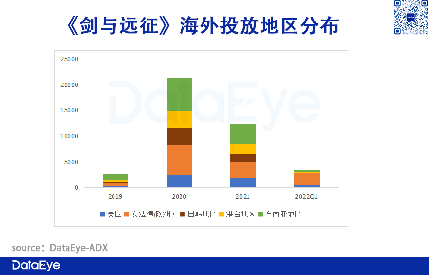 在出海高速增长阶段,《剑与远征》同样以东南亚市场和欧洲市场为主要投放地区。但根据单个国家/地区的投放量来看,各区域在投放素材量的数据上相对平均。
