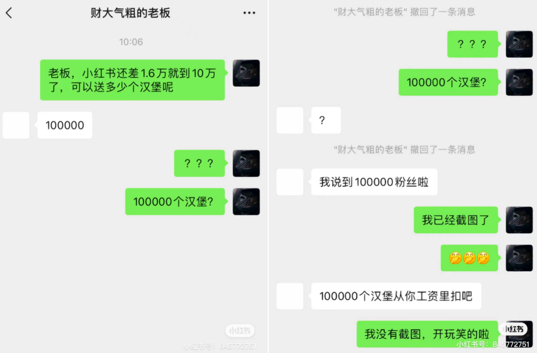 图源@塔斯汀小红书官方号,在最近的一则小红书笔记里,品牌方抛出了「涨粉到10万老板就送10万汉堡的梗」