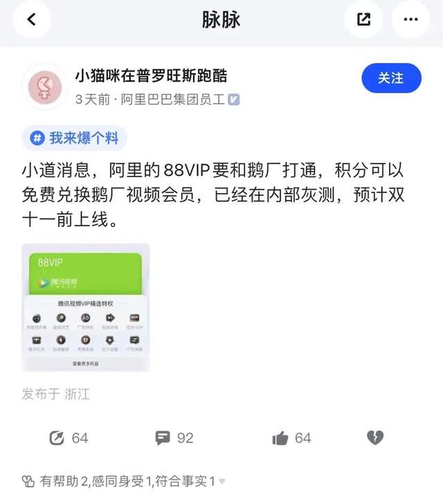 10月11日,有认证为阿里巴巴集团的员工在脉脉爆料称,“88VIP积分将可以免费兑换腾讯视频会员,已经在内部灰度测试,预计双十一前上线”,
