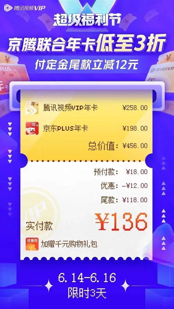 过去几年时间里,京东PLUS会员一直在保持着与腾讯的紧密合作,尤其在今年618前夕,双方更是升级了“京腾年卡会员”,用户仅需136元就能拿到腾讯视频VIP年卡+京东PLUS年卡,而这个价格,基本上是等同于买腾讯视频的年费会员再白送一个京东PLUS年卡。