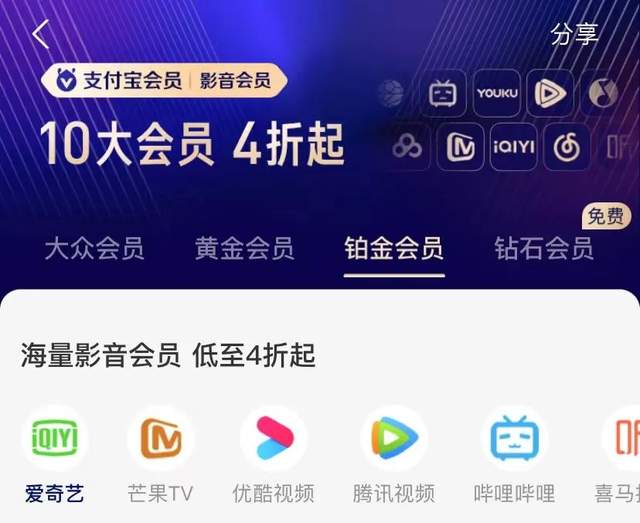 类似的方式其实阿里此前就有过尝试,比如之前在支付宝里,用户可通过支付宝积分兑换其他10大影音平台的会员,包括腾讯视频、爱奇艺、芒果TV等。