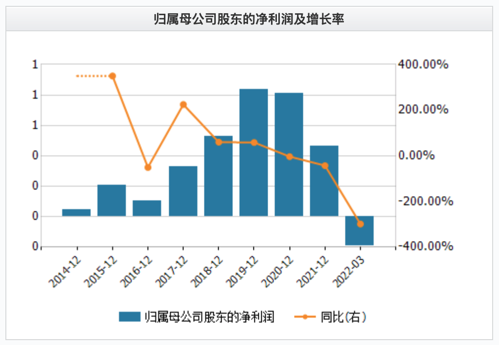这样一看,拼凑起来的公司业绩变脸或许也是意料之中了。2020年与2021年,公司归母净利润分别下滑3.41%、42.93%。2022年一季度公司业绩更是由盈转亏,净亏损1901.93万元,同时营业收入仅335.59万元,同比大幅下滑90%。