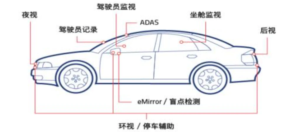 流媒体中央后视镜CMS:因FOV拓宽(15°-35°)和有效距离延伸,对于消除盲区非常有效,夜晚优势更明显。目前全球只有日本和欧洲的法规允许使用电子后视镜系统代替玻璃视镜,中国目前允许安装但不允许取代,但在国家强制性安全标准GB15084(机动车辆间接视野装置性能和安装要求)实施后,取代传统外后视镜、装载CMS的新车型将被允许上市销售。