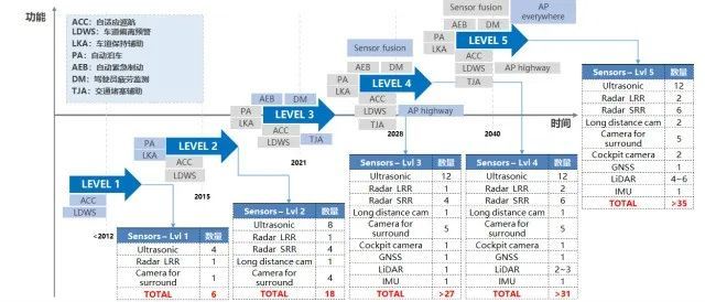 环境感知,如附近车辆、车道线、行人、交通标志、信号灯等,利用四大硬件传感器。从传感器的形态和功能维度来看,可以分为几个阶段: