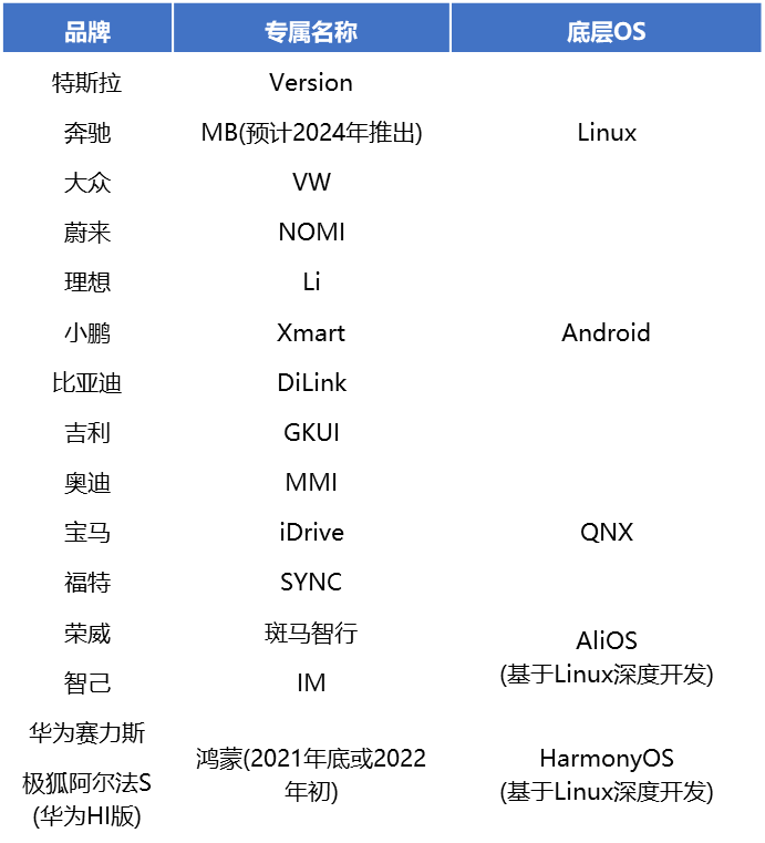 车载操作系统是唯一可驱动硬件工作的部分,内核主要有Linux家族(包括Android)、RTOS家族(包括QNX\Vxworks)等。