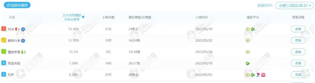 5月份,爱奇艺新上线《对决》、《暗夜行者》、《警察荣耀》等多部剧集,其中独播剧《暗夜行者》、《警察荣耀》迅速成为头部内容。