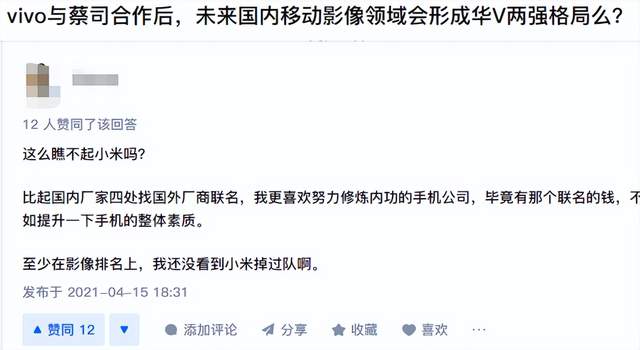 在vivo宣布与蔡司达成战略合作之后,有人在知乎发问移动影像领域是否会形成华v两强格局,有网友以小米为例答道: