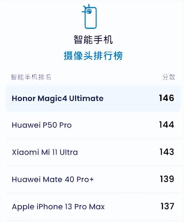 以DXO Mark的评测结果为例,目前榜单排名前三的分别是荣耀、华为和小米的当家旗舰,不同名次之间分数之差仅为1分、2分。排名前五里,除华为之外,其他机型都没有联名。