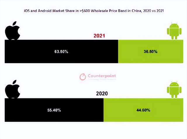 根据Counterpoint Research发布的报告,2021年,中国600美元以上价位的安卓智能手机市场份额从2020年的44.6%缩水至2021年的36.5%,高端市场份额进一步向苹果集中。5000元以上市场,苹果市占率从2020年的48%大幅上涨至75%。