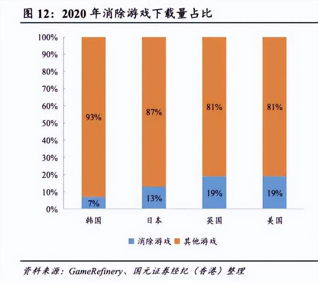 而且,“三消游戏”不仅在国内受欢迎,在欧美国家同样深受游戏玩家喜爱。据GameRefinery报告,2020年消除类游戏是美国和英国最大的细分游戏品类,均占所有游戏的19%,约占整体市场收入的27%和24%。