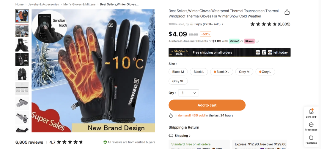 在平台卖爆了的手套,在Temu的官网上显示价格4.09美金