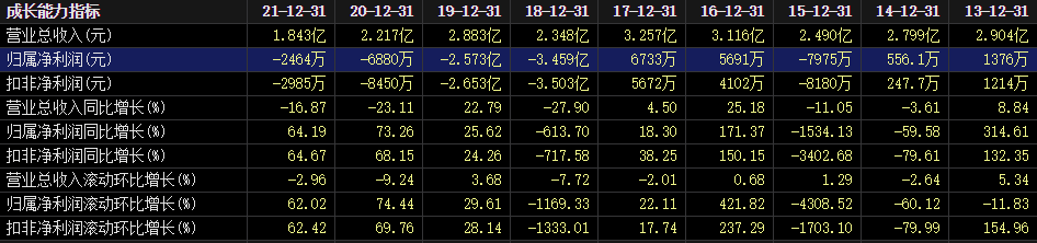 2018年至2021年,三五互联的营业收入分别约2.35亿元、2.88亿元、2.22亿元和1.84亿元,同比分别增长-27.9%、22.79%、-23.11%和-16.87%;同期归属净利润分别约-3.46亿元、-2.57亿元、-6880.27万元和-2464万元,同比分别增长-613.7%、25.62%、73.26%和64.19%。