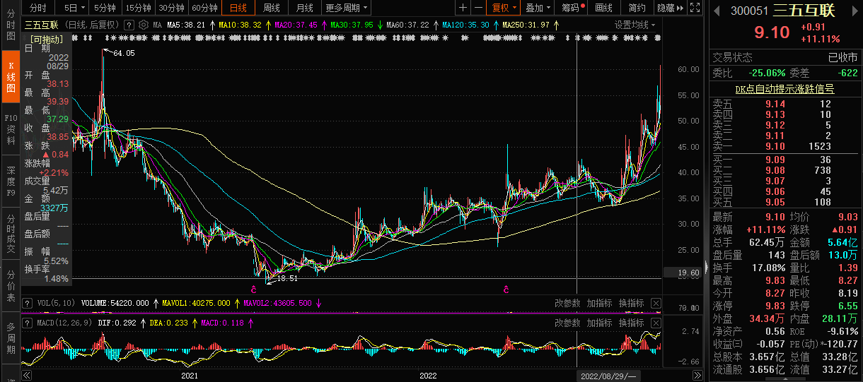 2022年的最后一个交易日,三五互联走出了收涨行情。